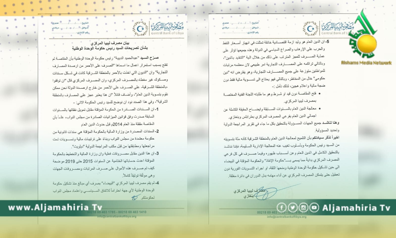 وحول ما قاله رئيس الحكومة، عبد الحميد الدبيبة، بأن المقاصة لم تفتح بسبب استمرار أعمال الصرف على الأحمر من أرصدة المصارف التجارية، وأن الديون التي أخذت بالأحمر من المنطقة الشرقية، كانت في شكل سندات وصكوك غير مغطاة بالمصرف المركزي، رد المصرف في بيانه: أن السندات الصادرة من الحكومة المؤقتة مقابل تمويل نفقاتها بالسنوات السابقة، صدرت وفق قوانين الميزانيات الصادرة عن مجلس النواب، وأن المقاصة مقفلة منذ عام 2014 قبل حدوث الدين العام.