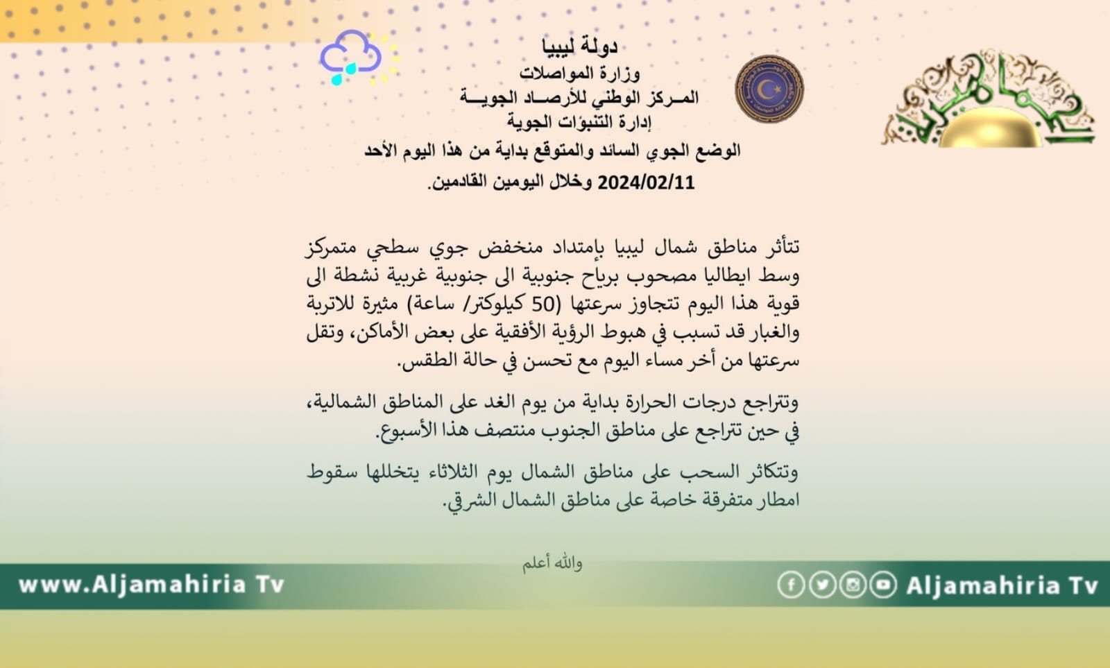 توقع مركز الأرصاد الجوية تأثر مناطق شمال ليبيا بامتداد منخفض جوي سطحي متمركز وسط ايطاليا مصحوب برياح جنوبية الى جنوبية غربية نشطة الى قوية هذا اليوم تتجاوز سرعتها (50 كيلوكتر/ ساعة) مثيرة للأتربة والغبار قد تسبب في هبوط الرؤية الأفقية على بعض الأماكن، وتقل سرعتها من أخر مساء اليوم مع تحسن في حالة الطقس.