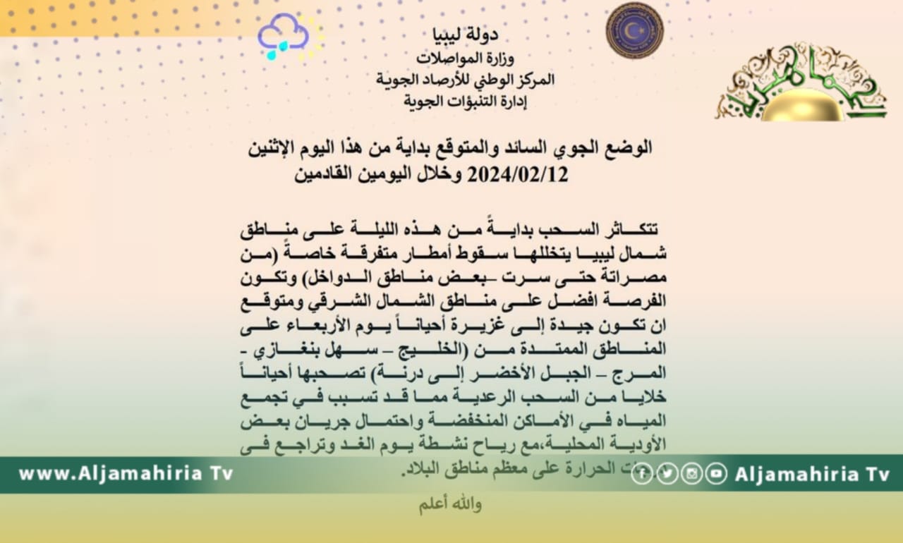 توقع مركز الأرصاد الجوية، تكاثر السحب بدايةً من هذه الليلة على مناطق شمال ليبيا يتخللها سقوط أمطار متفرقة خاصةً (من مصراتة حتى سرت –بعض مناطق الدواخل) وتكون الفرصة افضل على مناطق الشمال الشرقي ومتوقع ان تكون جيدة إلى غزيرة أحياناً يوم الأربعاء على المناطق الممتدة من (الخليج – سهل بنغازي – المرج – الجبل الأخضر إلى درنة) تصحبها أحياناً خلايا من السحب الرعدية مما قد تسبب في تجمع المياه في الأماكن المنخفضة واحتمال جريان بعض الأودية المحلية،مع رياح نشطة يوم الغد وتراجع فى درجات الحرارة على معظم مناطق البلاد.