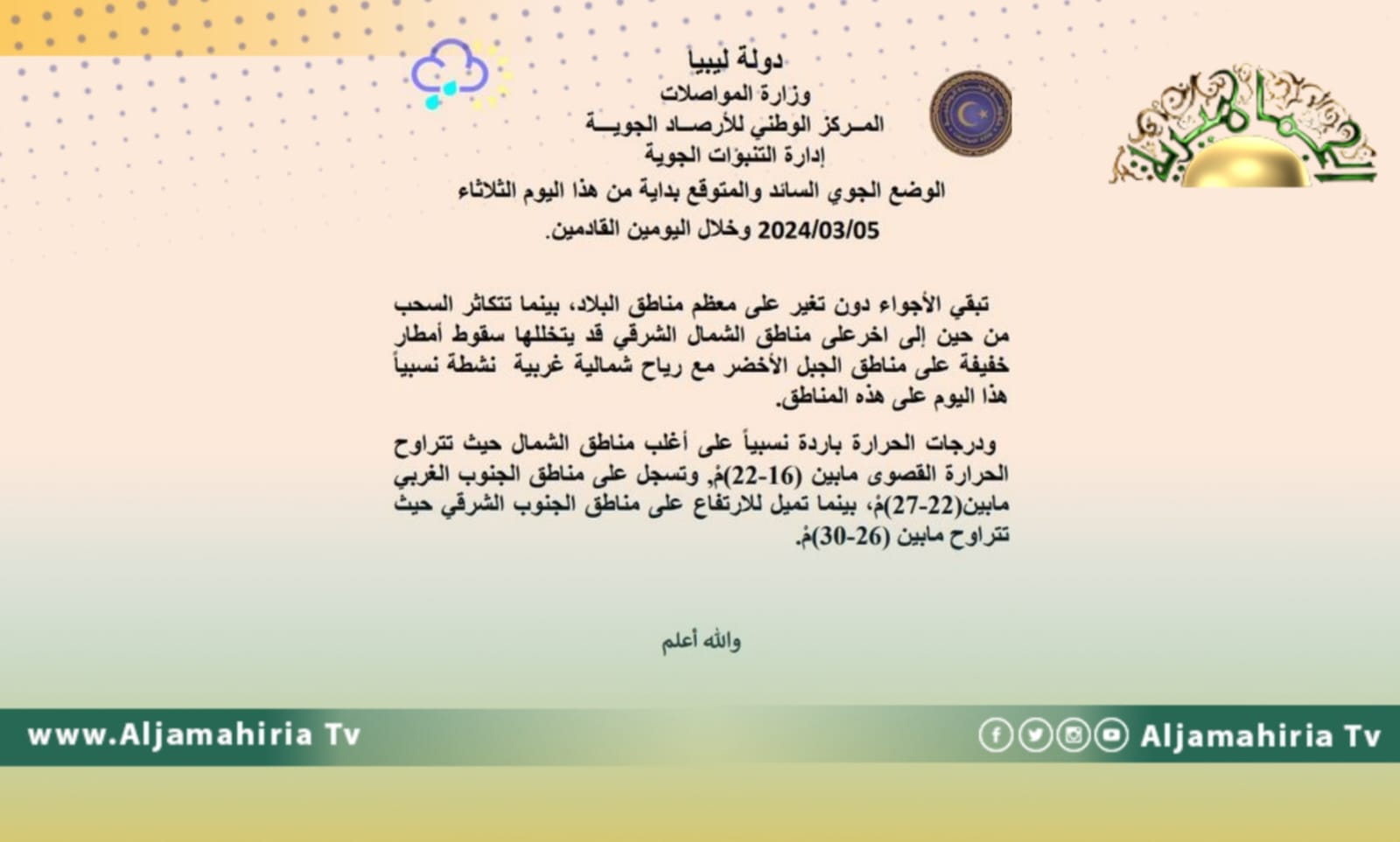 توقع مركز الأرصاد الجوية، أن تبقي الأجواء دون تغير على معظم مناطق البلاد، بينما تتكاثر السحب من حين إلى آخرعلى مناطق الشمال الشرقي قد يتخللها سقوط أمطار خفيفة على مناطق الجبل الأخضر مع رياح شمالية غربية نشطة نسبياً هذا اليوم على هذه المناطق.