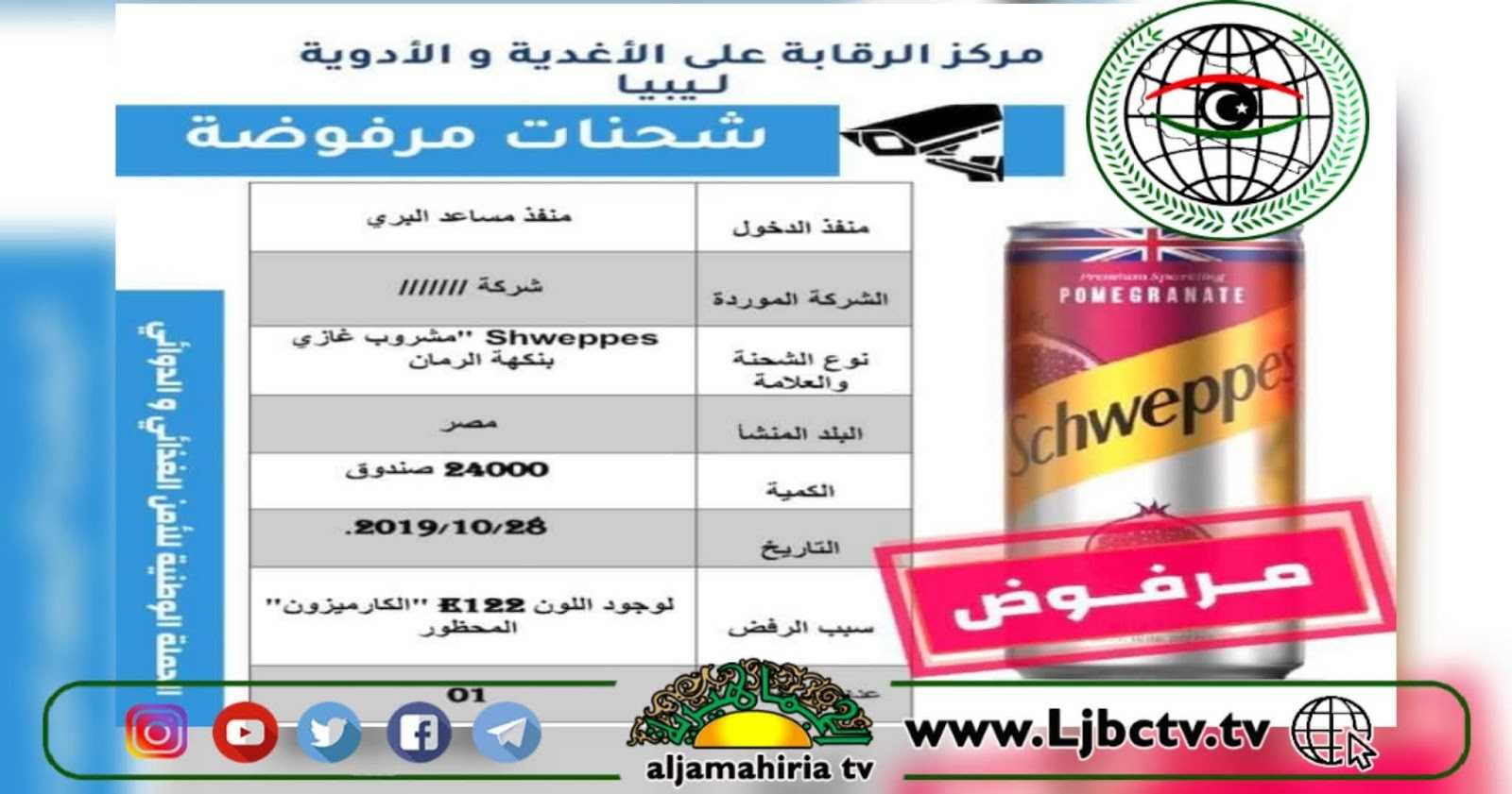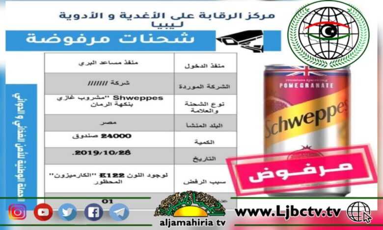 رفض مركز الرقابة على الأغذية والأدوية، أصبح السبت، دخول شحنة مشروب غازي «شويبس» تبلغ 24 ألف صندوق، موردة من مصر عبر منفذ مساعد البري.