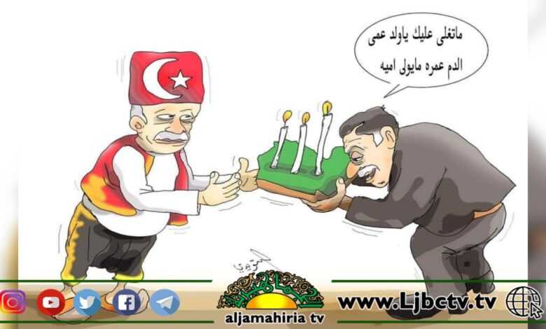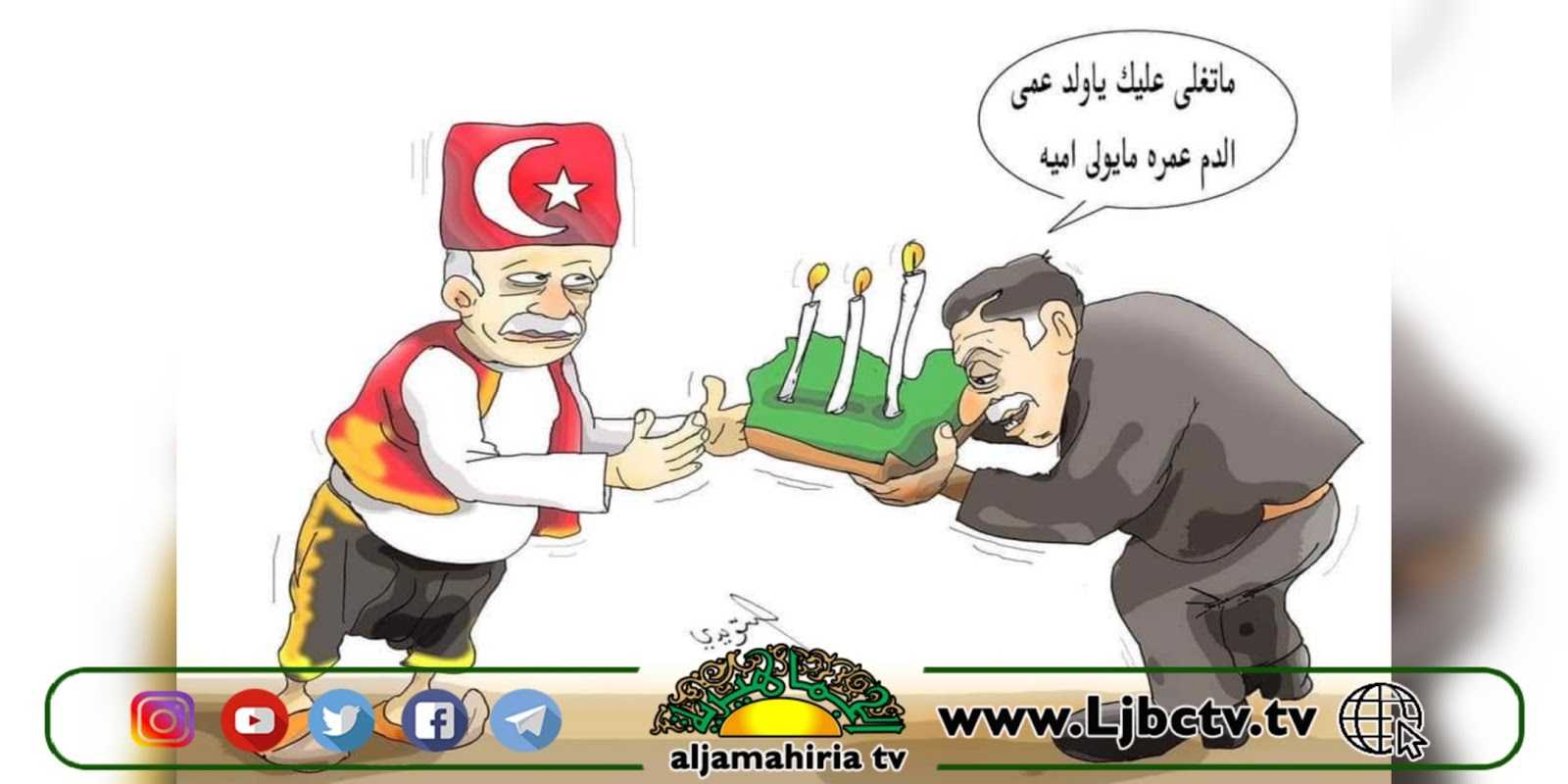 كريكاتير لرئيس المجلس الرئاسي فايز السراج وهو يقدم فروض الطاعة للحاكم التركي أردوغان