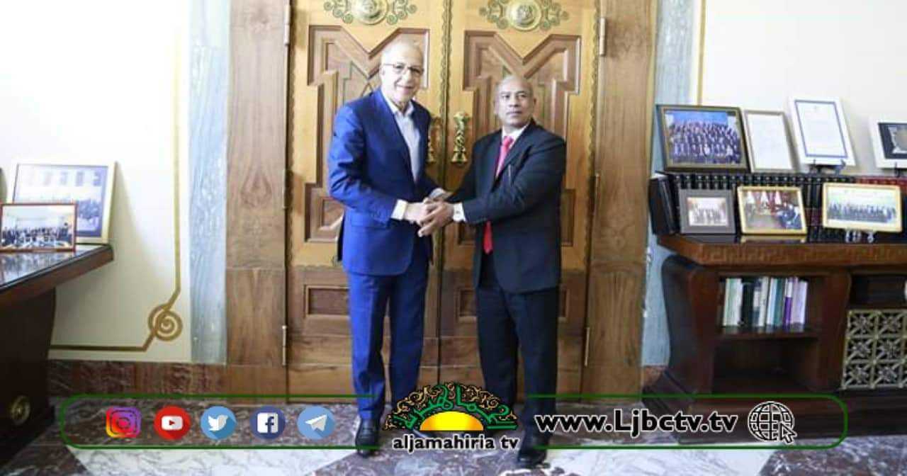عقد محافظ مصرف ليبيا المركزي بطرابلس الصديق الكبير بمكتبه مناقشات مع شيخ سكندر علي سفير دولة بنجلاديش لدى ليبيا.