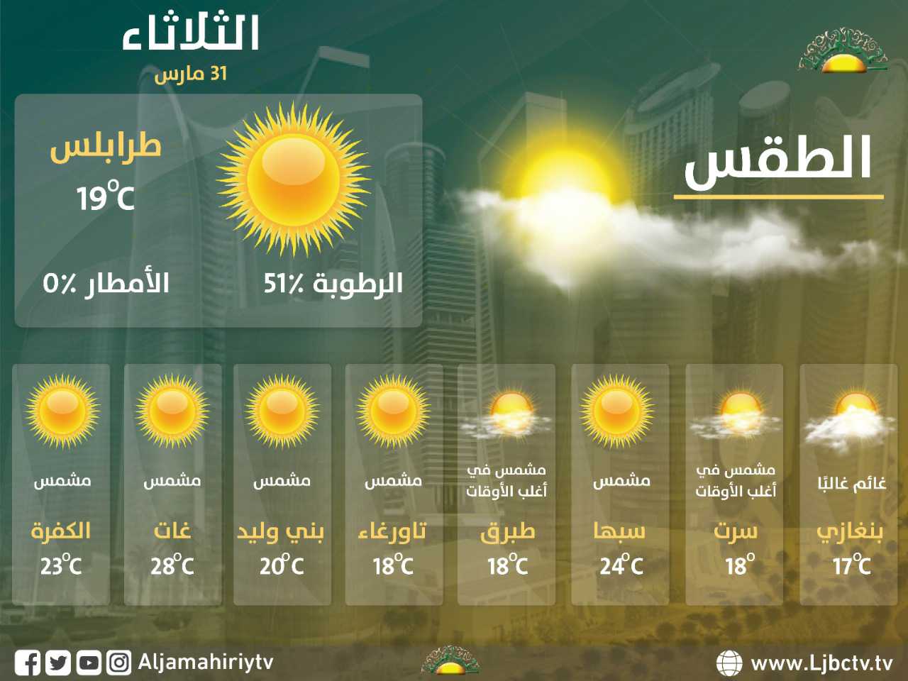 اجواء مغيمة علي مناطق الشمال الشرقي مع فرصة سقوط أمطار متفرقة هذا اليوم علي المنطقة الممتدة من بنغازي ومرتفعات الجبل الأخضر حتي الأبرق ، ودرجات الحرارة العظمى المتوقع تسجيلها هذا اليوم على أغلب مناطق الشمال تتراوح ما بين (11 – 20) مْ بينما تتراوح ما بين (23 – 27) على مناطق الوسط والجنوب.