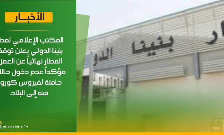 المكتب الإعلامي لمطار بنينا الدولي : يعلن توقف المطار نهائياً عن العمل، مؤكداً عدم دخول حالات حاملة لفيروس #كورونا منه إلى البلاد.