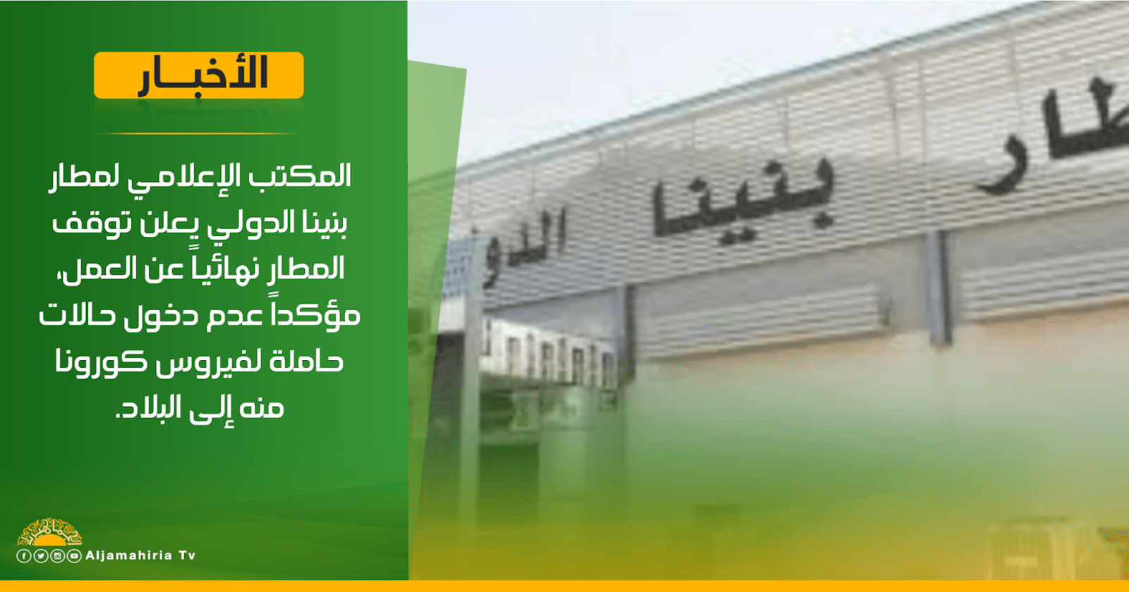 عاجل | المكتب الإعلامي لمطار بنينا الدولي : يعلن توقف المطار نهائياً عن العمل، مؤكداً عدم دخول حالات حاملة لفيروس #كورونا منه إلى البلاد. #ليبيا #قناة_الجماهيرية_العظمى