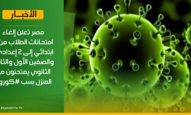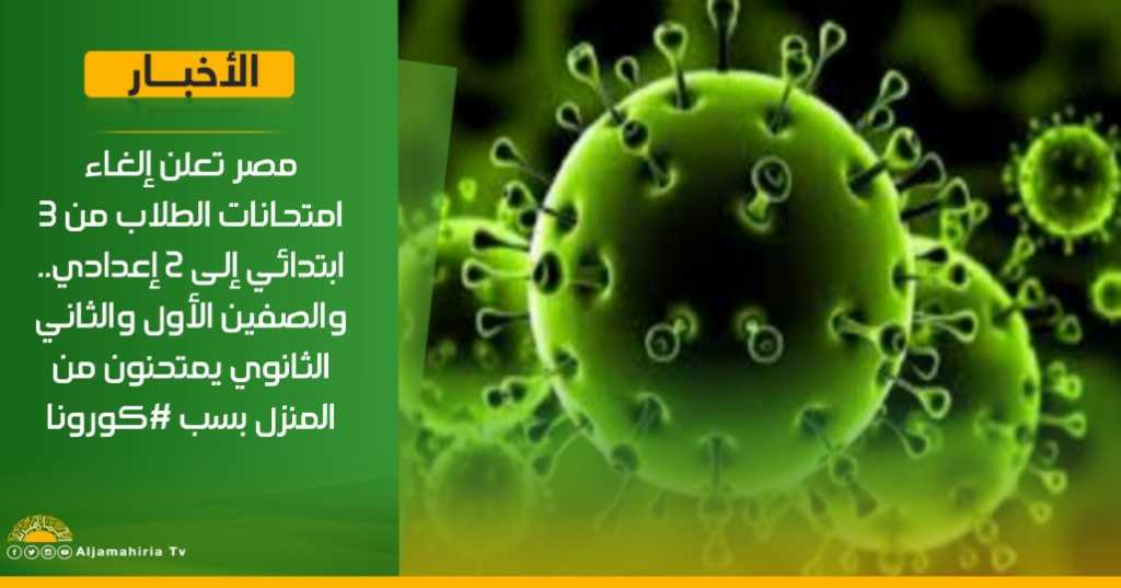 عاجل | مصر تعلن إلغاء امتحانات الطلاب من 3 ابتدائي إلى 2 إعدادي.. والصفين الأول والثاني الثانوي يمتحنون من المنزل بسب كورونا #ليبيا #قناة_الجماهيرية_العظمى