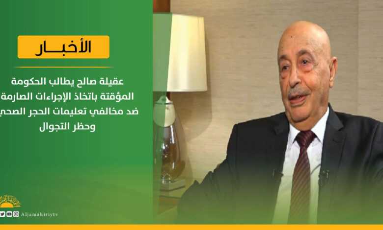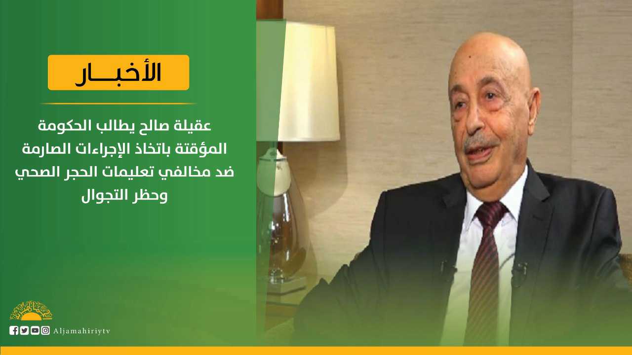 طالب رئيس مجلس النواب المنعقد في #طبرق، عقيلة صالح، الحكومة المؤقتة بعدم التهاون واتخاذ جميع الإجراءات الصارمة مع أي شخص لا يلتزم بالتعليمات الصادرة بشأن الحجر الصحي وحظر التجول لمنع دخول وباء #كورونا للبلاد، وفقا لقناة الفضائية الليبية.
