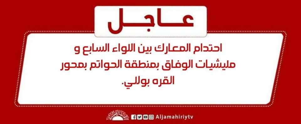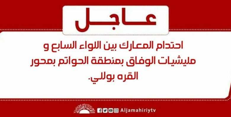عاجل // احتدام المعارك بين اللواء السابع و مليشيات الوفاق بمنطقة الحواتم بمحور القره بوللي.  #قناة_الجماهيرية_العظمى_قناة_كل_الجماهير