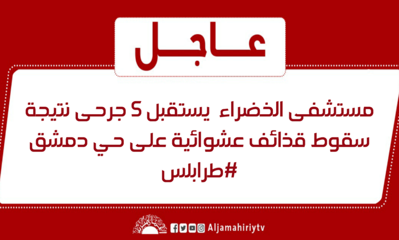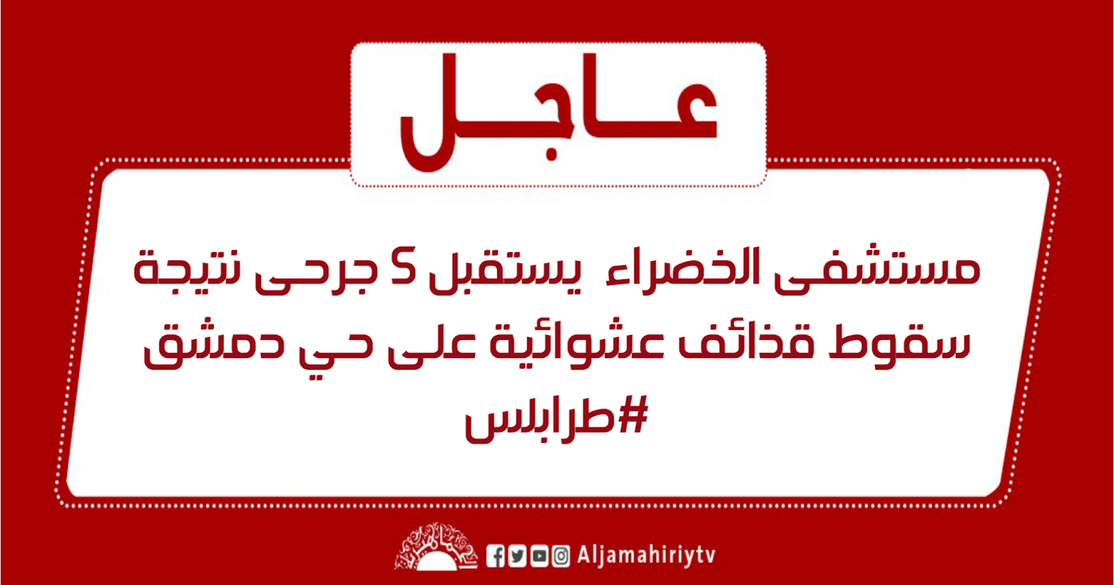 مستشفى الخضراء : يستقبل 5 جرحى نتيجة سقوط قذائف عشوائية على حي دمشق #طرابلس .