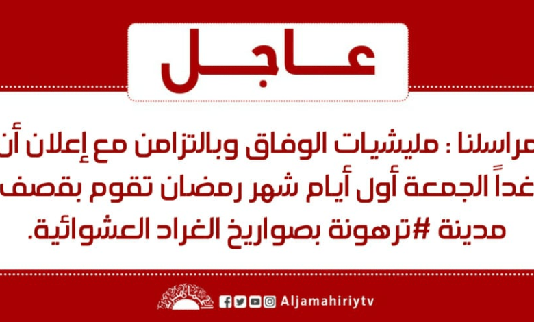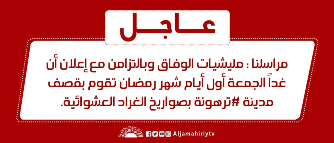 عاجل // مراسلنا : مليشيات الوفاق وبالتزامن مع إعلان أن غداً الجمعة أول أيام شهر رمضان تقوم بقصف مدينة #ترهونة بصواريخ الغراد العشوائية #قناة_الجماهيرية_العظمى_قناة_كل_الجماهير