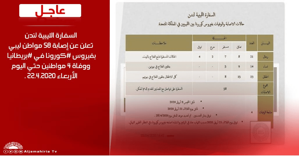 عاجل // السفارة الليبية لندن تعلن عن إصابة 58 مواطن ليبي بفيروس #كورونا في #بريطانيا ووفاة 4 مواطنين حتي اليوم الأربعاء 22.4.2020 #قناة_الجماهيرية_العظمى_قناة_كل_الجماهير