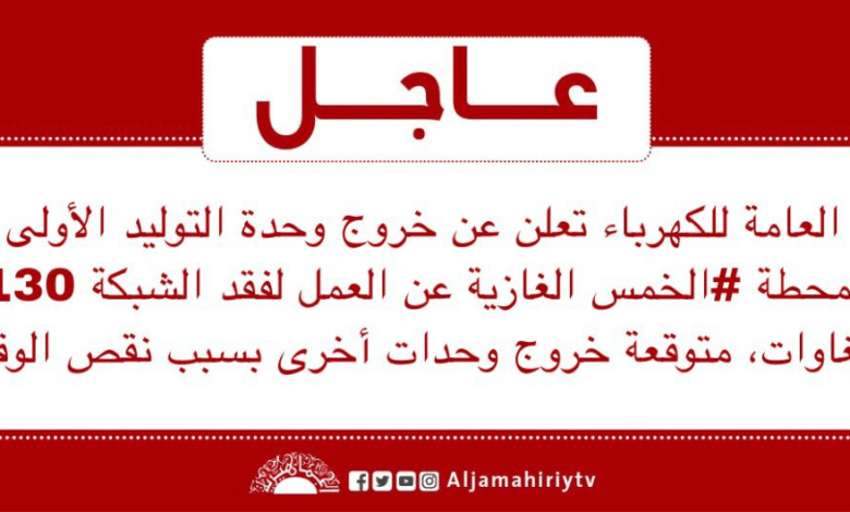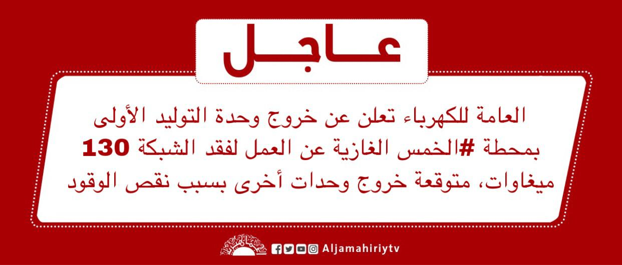 عاجل // العامة للكهرباء تعلن عن خروج وحدة التوليد الأولى بمحطة #الخمس الغازية عن العمل لفقد الشبكة 130 ميغاوات، متوقعة خروج وحدات أخرى بسبب نقص الوقود #قناة_الجماهيرية_العظمى_قناة_كل_الجماهير