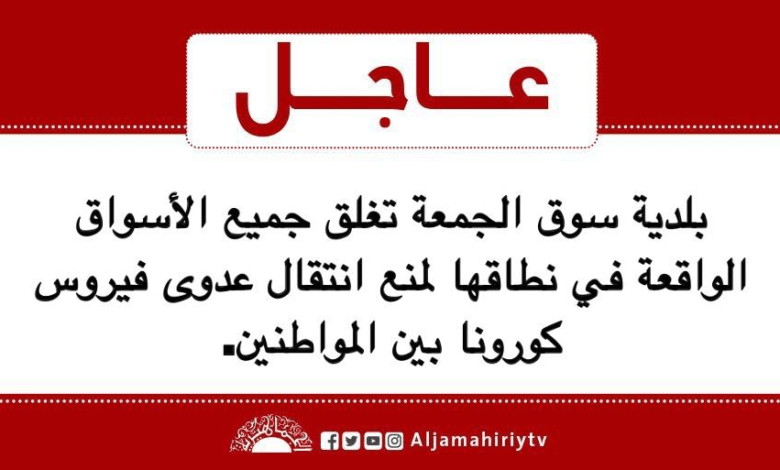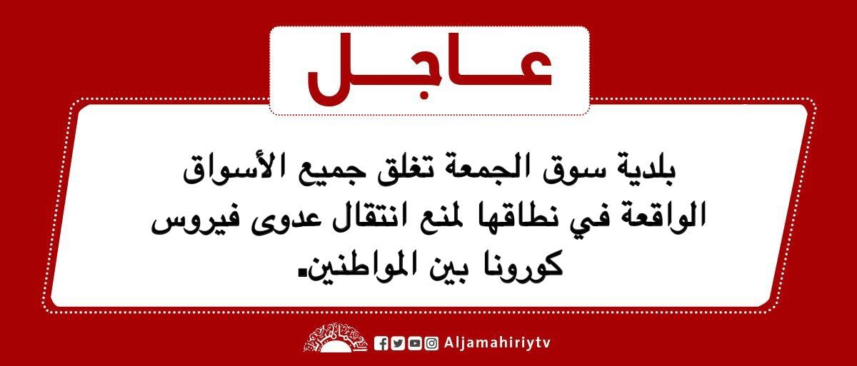 عاجل // بلدية سوق الجمعة تغلق جميع الأسواق الواقعة في نطاقها لمنع انتقال عدوى فيروس #كورونا بين المواطنين #قناة_الجماهيرية_العظمى_قناة_كل_الجماهير