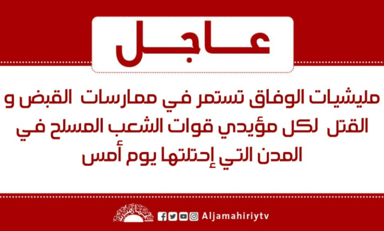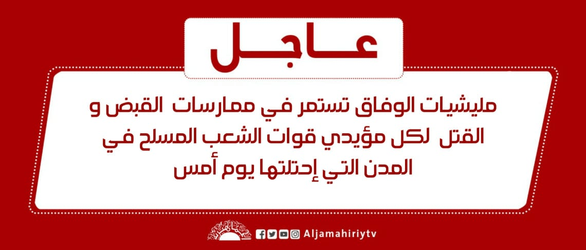 عاجل // مليشيات الوفاق تستمر في ممارسات القبض و القتل لكل مؤيدي قوات الشعب المسلح في المدن التي إحتلتها يوم أمس #قناة_الجماهيرية_العظمي_قناة_كل_الجماهير