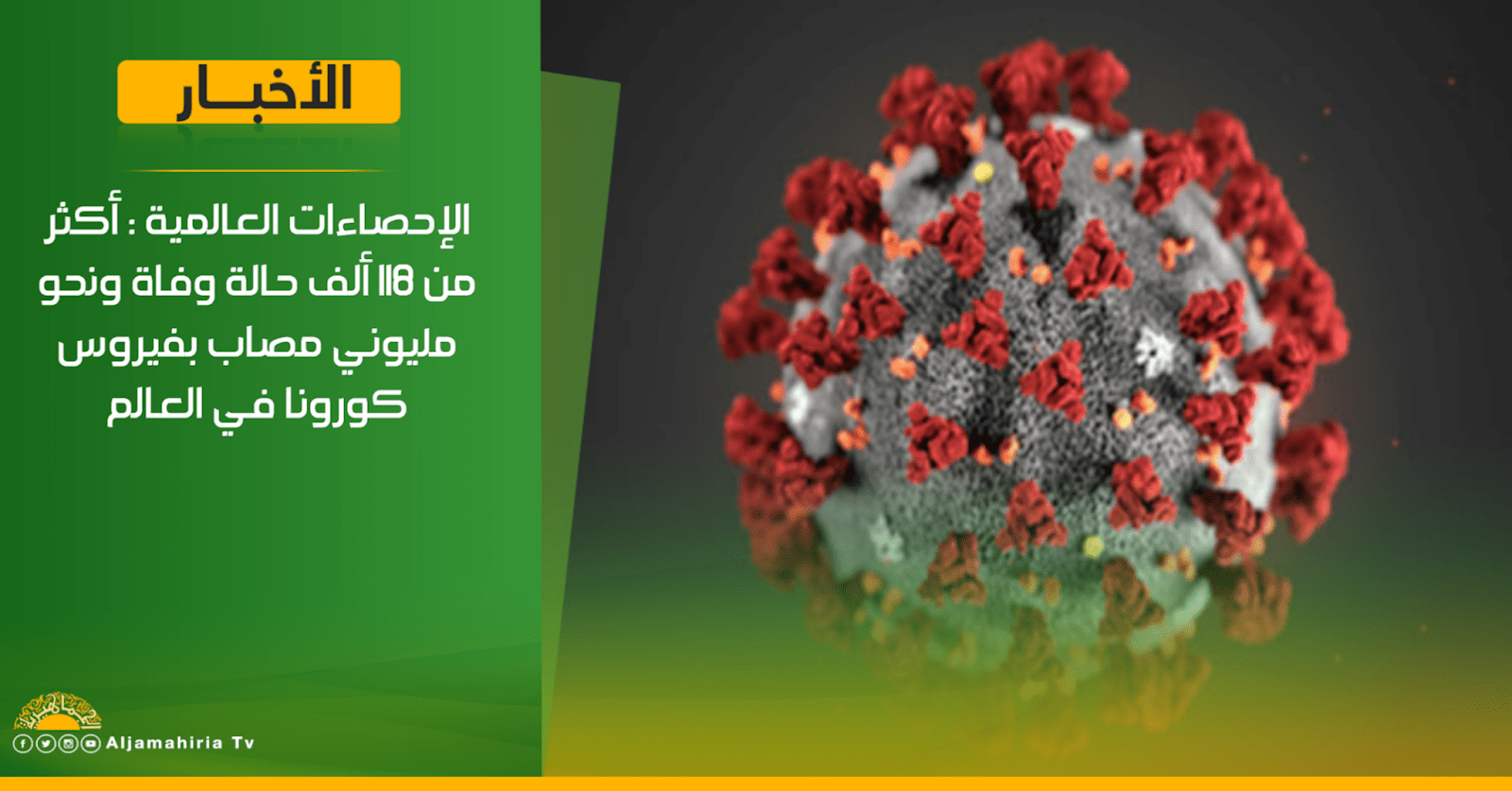 الإحصاءات العالمية : أكثر من 118 ألف حالة وفاة ونحو مليوني مصاب بفيروس كورونا في العالم #قناة_الجماهيرية_العظمي_قناة_كل_الجماهير