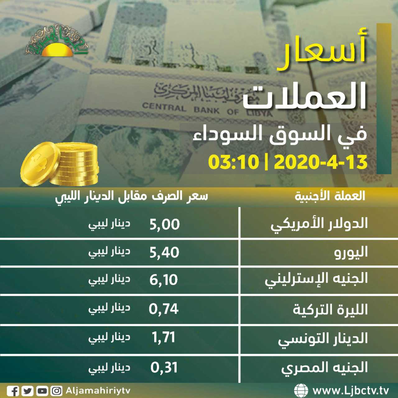 أسعار العملات الأجنبية مقابل الدينار الليبي اليوم الاثنين 13 ابريل 2020 بالسوق الموازي #قناة_الجماهيرية_العظمي_قناة_كل_الجماهير