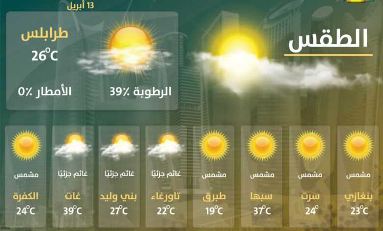 تقع أغلب مناطق غرب ليبيا خاصة مناطق الشمال الغربي بداية من هذا اليوم تحت تأثير امتداد لمنخفض جوي صحراوي يتمركز وسط الجزائر ويتحرك المنخفض ناحية الشمال الشرقي ينتج عنه تقلبات جوية مصحوبة بارتفاع ملحوظ في درجات الحرارة مع رياح نشطة نسبيا مما تسبب في إثارة الأتربة والغبار على بعض المناطق وتشمل هذه التقلبات ظهر يوم الغد أغلب مناطق الشرق خاصة مناطق الشمال الشرقي.