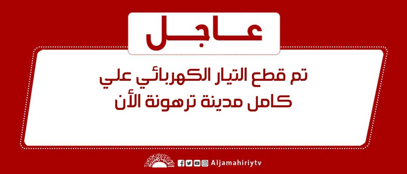 عاجل | تم قطع التيار الكهربائي علي كامل مدينة ترهونة الأن .#قناة_الجماهيرية_العظمي_قناة_كل_الجماهير