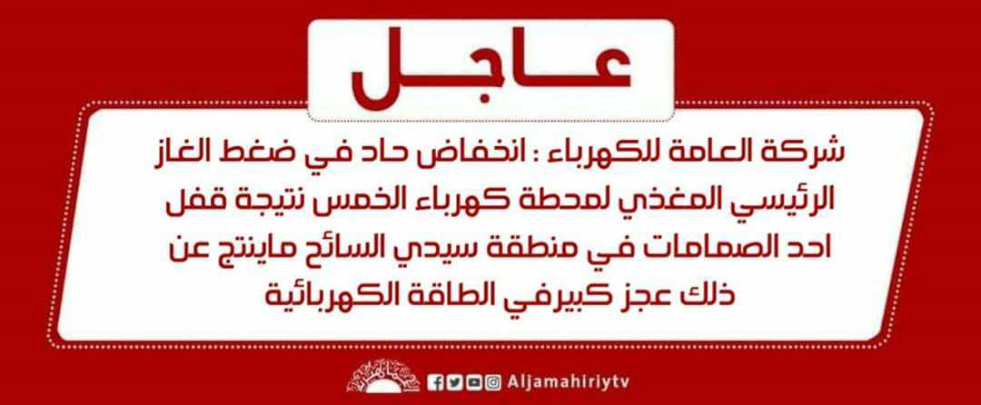 شركة العامة للكهرباء : انخفاض حاد في ضغط الغاز الرئيسي المغذي لمحطة كهرباء الخمس نتيجة قفل احد الصمامات في منطقة سيدي السائح ماينتج عن ذلك عجز كبيرفي الطاقة الكهربائية .