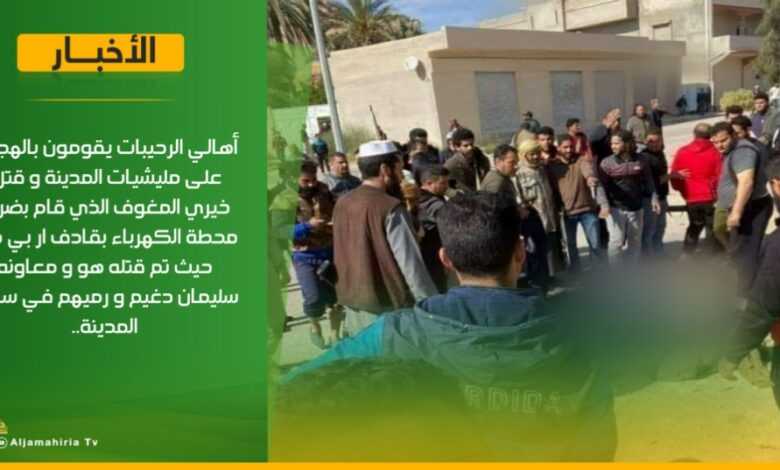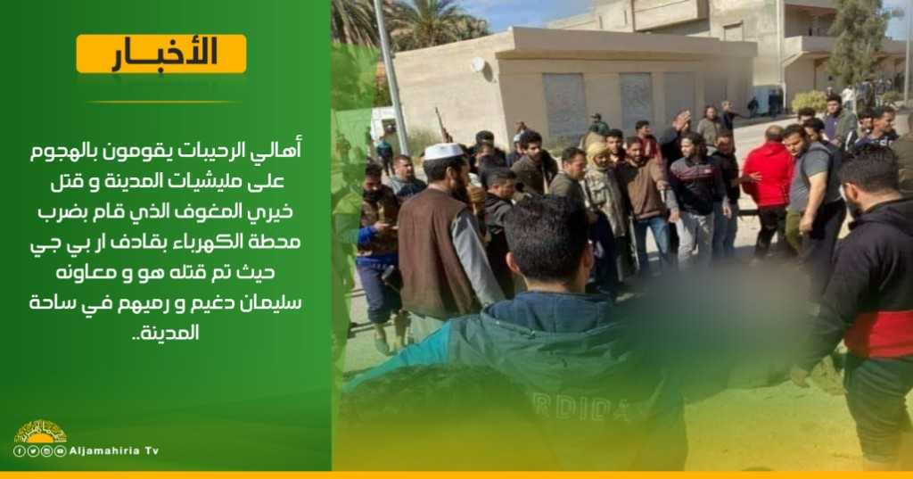 عاجل | أهالي الرحيبات يقومون بالهجوم على مليشيات المدينة و قتل خيري المغوف الذي قام بضرب محطة الكهرباء بقادف ار بي جي حيث تم قتله هو و معاونه سليمان دغيم و رميهم في ساحة المدينة..#قناة_الجماهيرية_العظمي_قناة_كل_الجماهير