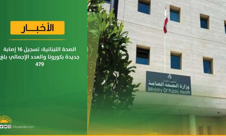 أعلنت وزارة الصحة اللبنانية، الأربعاء، تسجيل 16 إصابة جديدة بفيروس كورونا، مشيرة إلى أن العدد الإجمالي بلغ 479 إصابة.