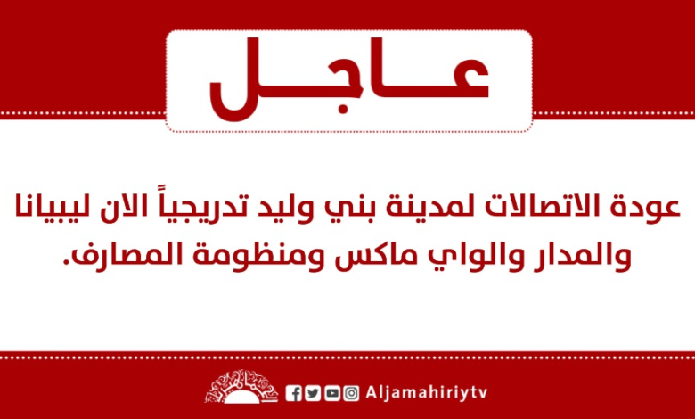 عاجل // عودة الاتصالات لمدينة بني وليد تدريجياً الان ليبيانا والمدار والواي ماكس ومنظومة المصارف.#قناة_الجماهيرية_العظمى_قناة_كل_الجماهير