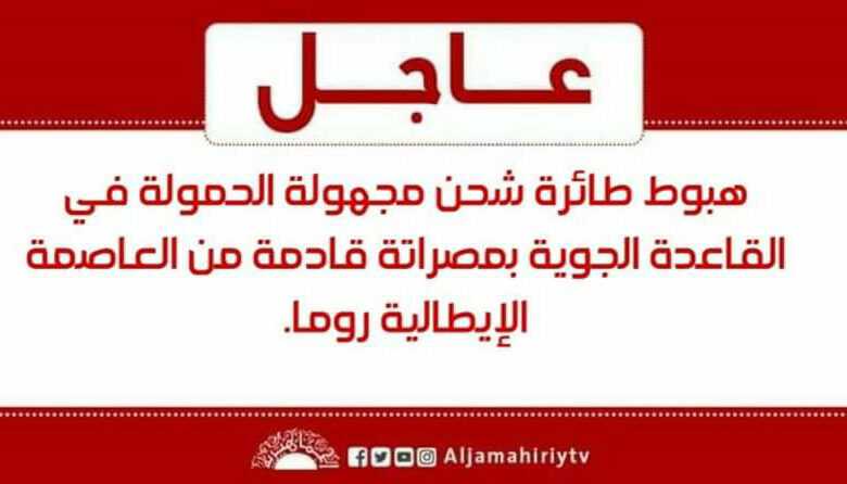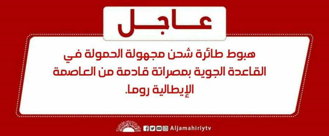 عاجل | هبوط طائرة شحن مجهولة الحمولة في القاعدة الجوية بمصراتة قادمة من العاصمة الإيطالية #روما. #قناة_الجماهيرية_العظمى_قناة_كل_الجماهير