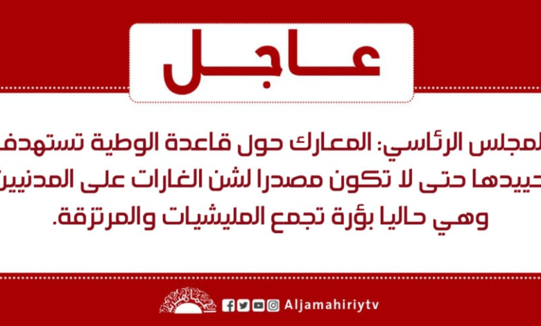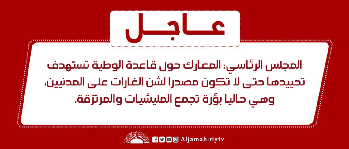 عاجل // المجلس الرئاسي: المعارك حول قاعدة الوطية تستهدف تحييدها حتى لا تكون مصدرا لشن الغارات على المدنيين، وهي حاليا بؤرة تجمع المليشيات والمرتزقة #قناة_الجماهيرية_العظمى_قناة_كل_الجماهير