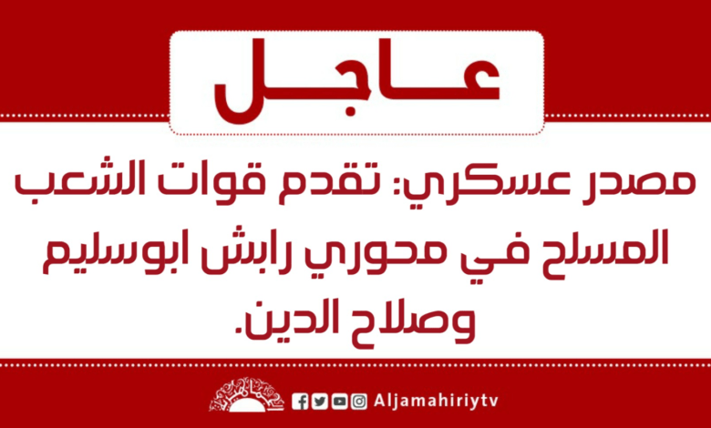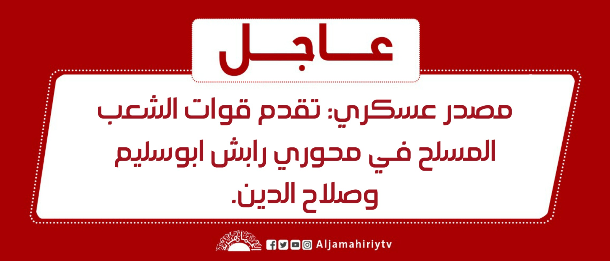 عاجل // مصدر عسكري: تقدم قوات الشعب المسلح في محوري رابش ابوسليم وصلاح الدين #قناة_الجماهيرية_العظمى_قناة_كل_الجماهير