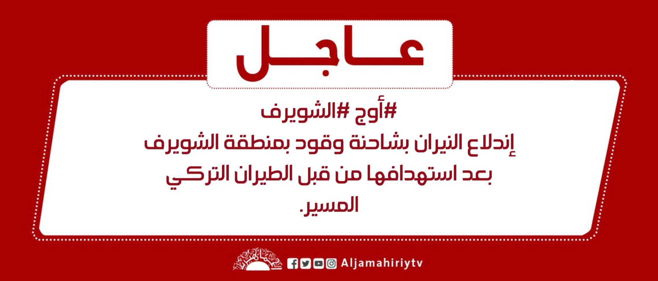 عاجل // إندلاع النيران بشاحنة وقود بمنطقة الشويرف بعد استهدافها من قبل الطيران التركي المسير #قناة_الجماهيرية_العظمى_قناة_كل_الجماهير