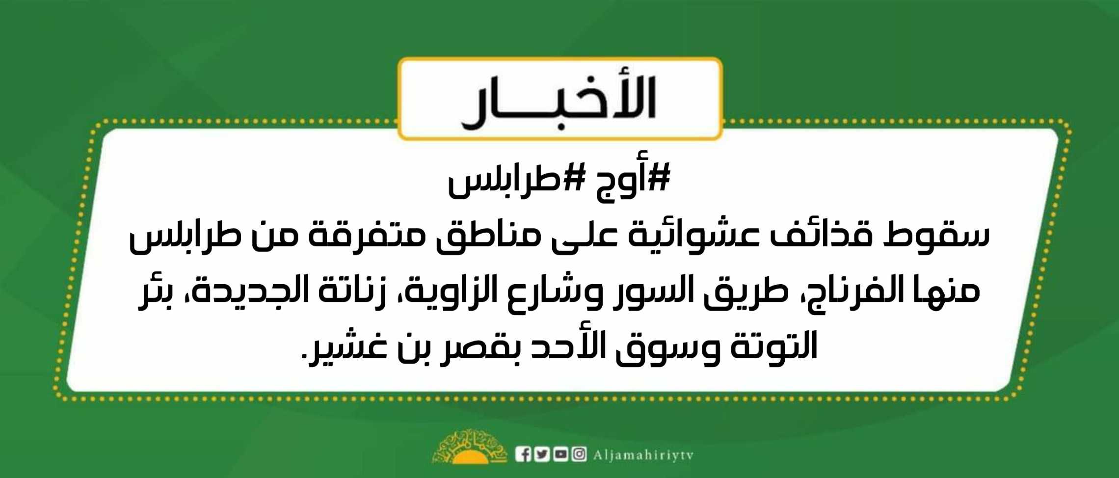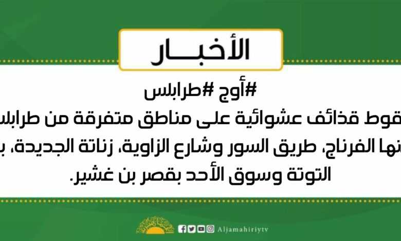 سقوط قذائف عشوائية على مناطق متفرقة من طرابلس منها الفرناج، طريق السور وشارع الزاوية، زناتة الجديدة، بئر التوتة وسوق الأحد بقصر بن غشير #قناة_الجماهيرية_العظمى_قناة_كل_الجماهير