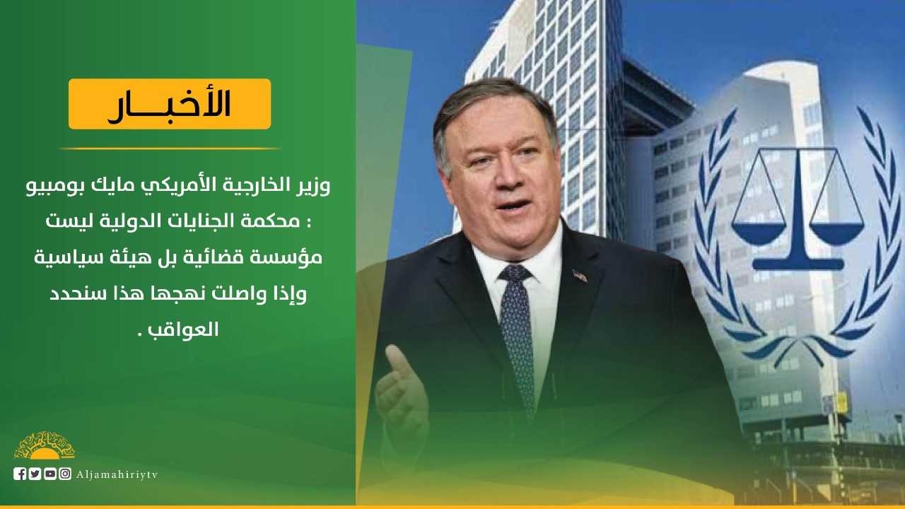 عاجل | وزير الخارجية الأمريكي مايك بومبيو : محكمة الجنايات الدولية ليست مؤسسة قضائية بل هيئة سياسية وإذا واصلت نهجها هذا سنحدد العواقب . #قناة_الجماهيرية_العظمى_قناة_كل_الجماهير