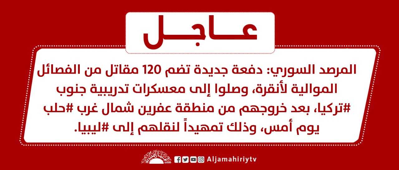 عاجل // المرصد السوري: دفعة جديدة تضم 120 مقاتل من الفصائل الموالية لأنقرة، وصلوا إلى معسكرات تدريبية جنوب #تركيا، بعد خروجهم من منطقة عفرين شمال غرب #حلب يوم أمس، وذلك تمهيداً لنقلهم إلى #ليبيا #قناة_الجماهيرية_العظمى_قناة_كل_الجماهير