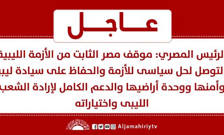 عاجل | الرئيس المصري: موقف مصر الثابت من الأزمة الليبية بالتوصل لحل سياسى للأزمة والحفاظ على سيادة ليبيا وأمنها ووحدة أراضيها والدعم الكامل لإرادة الشعب الليبى واختياراته .