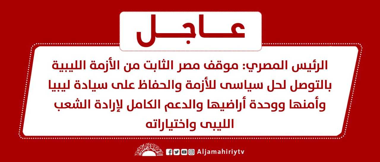 عاجل | الرئيس المصري: موقف مصر الثابت من الأزمة الليبية بالتوصل لحل سياسى للأزمة والحفاظ على سيادة ليبيا وأمنها ووحدة أراضيها والدعم الكامل لإرادة الشعب الليبى واختياراته #قناة_الجماهيرية_العظمى_قناة_كل_الجماهير