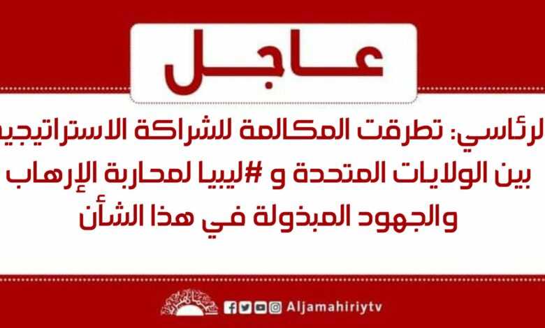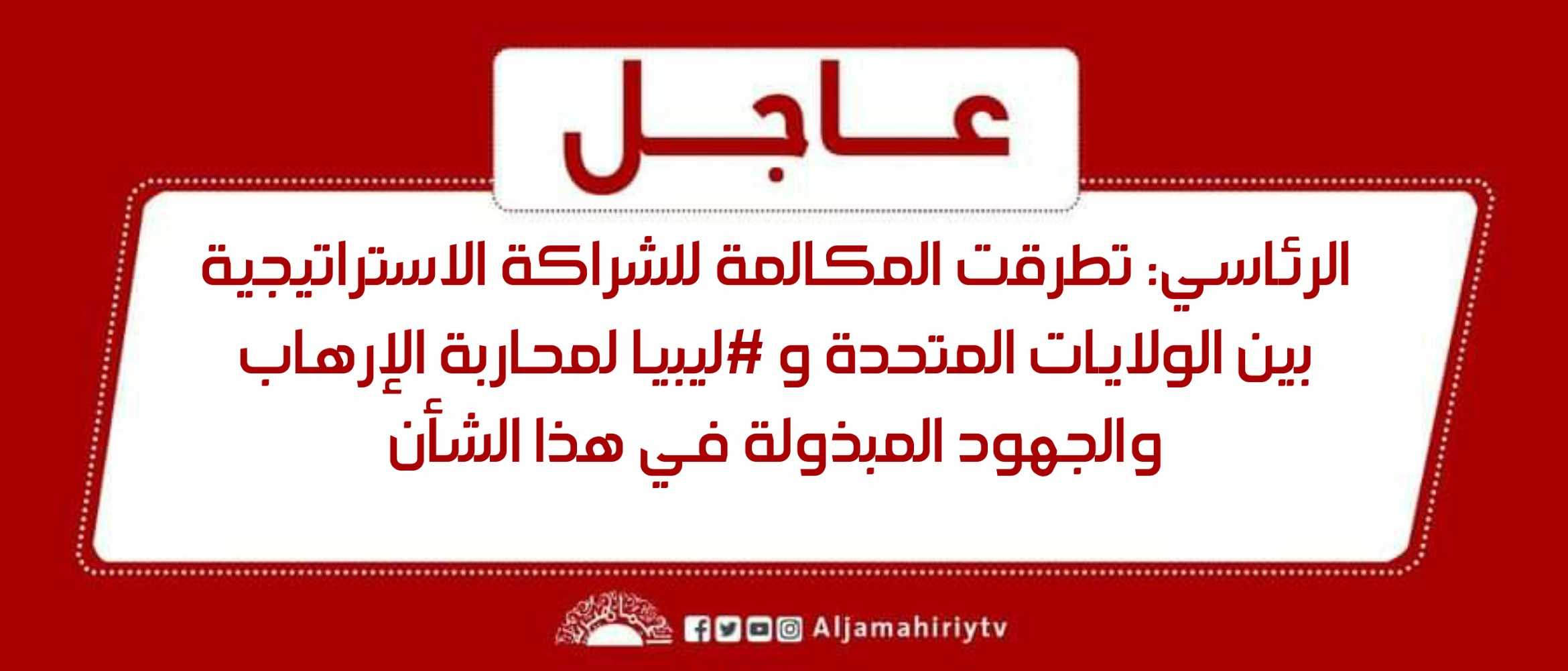 عاجل // الرئاسي: تطرقت المكالمة للشراكة الاستراتيجية بين الولايات المتحدة و #ليبيا لمحاربة الإرهاب والجهود المبذولة في هذا الشأن #قناة_الجماهيرية_العظمى_قناة_كل_الجماهير