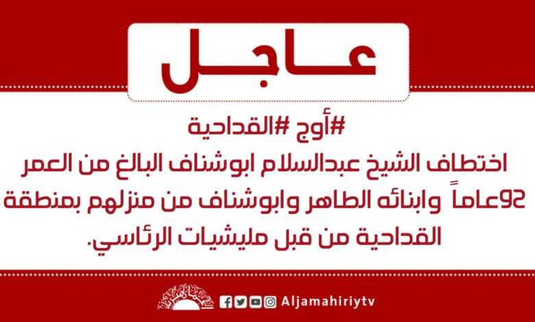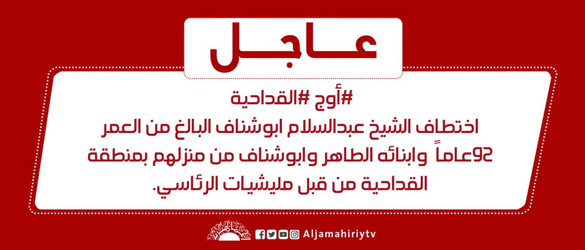 عاجل | #أوج #القداحية اختطاف الشيخ عبدالسلام ابوشناف البالغ من العمر 92عاماً وابنائه الطاهر وابوشناف من منزلهم بمنطقة القداحية من قبل مليشيات الرئاسي. #قناة_الجماهيرية_العظمى_قناة_كل_الجماهير