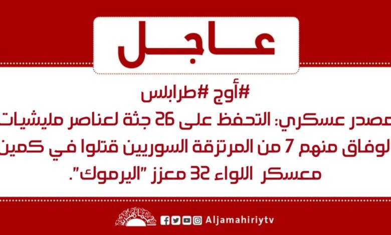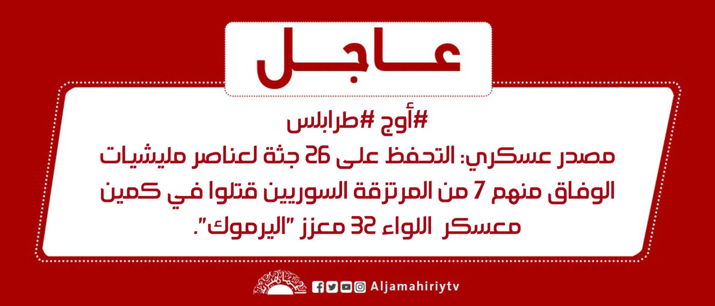 عاجل | #أوج #طرابلس مصدر عسكري: التحفظ على 26 جثة لعناصر مليشيات الوفاق منهم 7 من المرتزقة السوريين قتلوا في كمين معسكر اللواء 32 معزز "اليرموك".