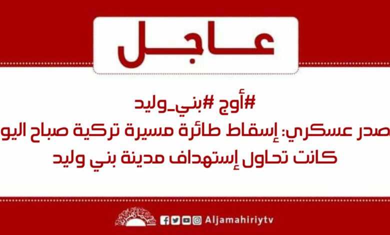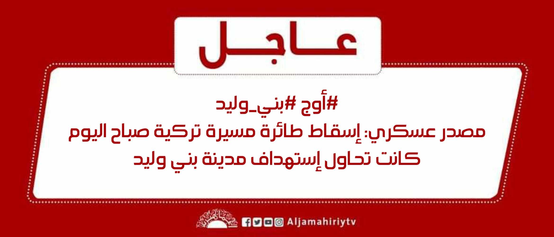 مصدر عسكري: إسقاط طائرة مسيرة تركية صباح اليوم كانت تحاول إستهداف مدينة بني وليد