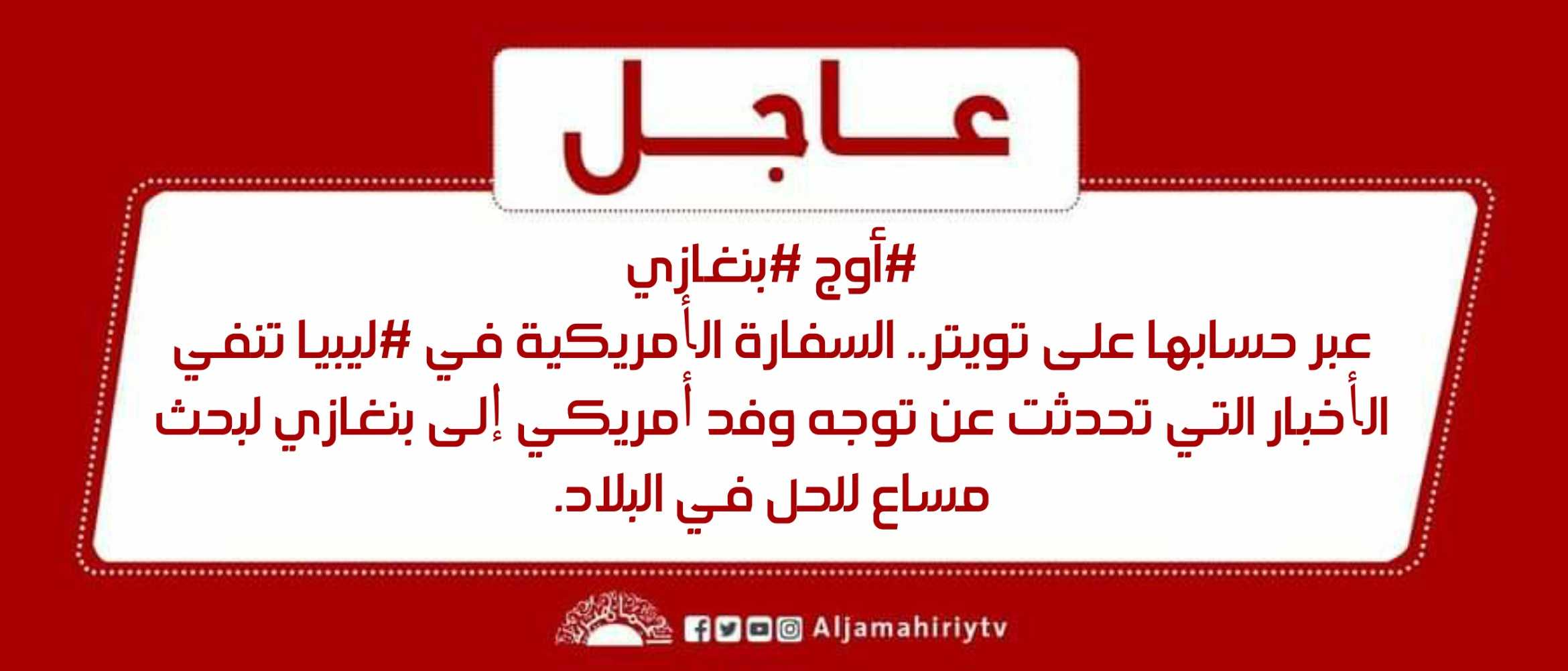 عاجل // عبر حسابها على تويتر.. السفارة الأمريكية في #ليبيا تنفي الأخبار التي تحدثت عن توجه وفد أمريكي إلى بنغازي لبحث مساع للحل في البلاد #قناة_الجماهيرية_العظمى_قناة_كل_الجماهير