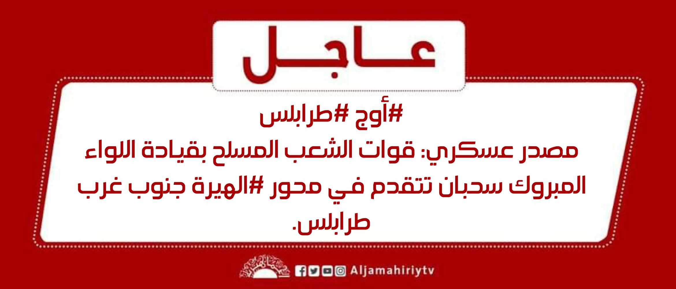 عاجل // مصدر عسكري: قوات الشعب المسلح بقيادة اللواء المبروك سحبان تتقدم في محور #الهيرة جنوب غرب طرابلس #قناة_الجماهيرية_العظمى_قناة_كل_الجماهير