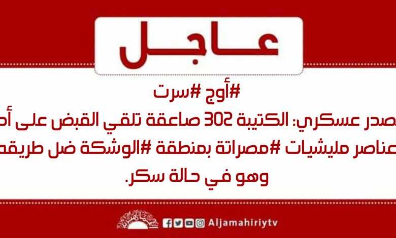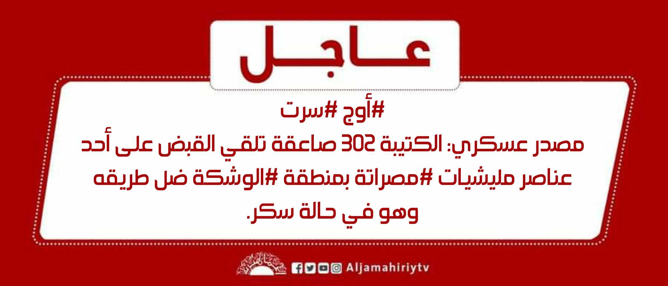 عاجل // مصدر عسكري: الكتيبة 302 صاعقة تلقي القبض على أحد عناصر مليشيات #مصراتة بمنطقة #الوشكة ضل طريقه وهو في حالة سكر #قناة_الجماهيرية_العظمى_قناة_كل_الجماهير