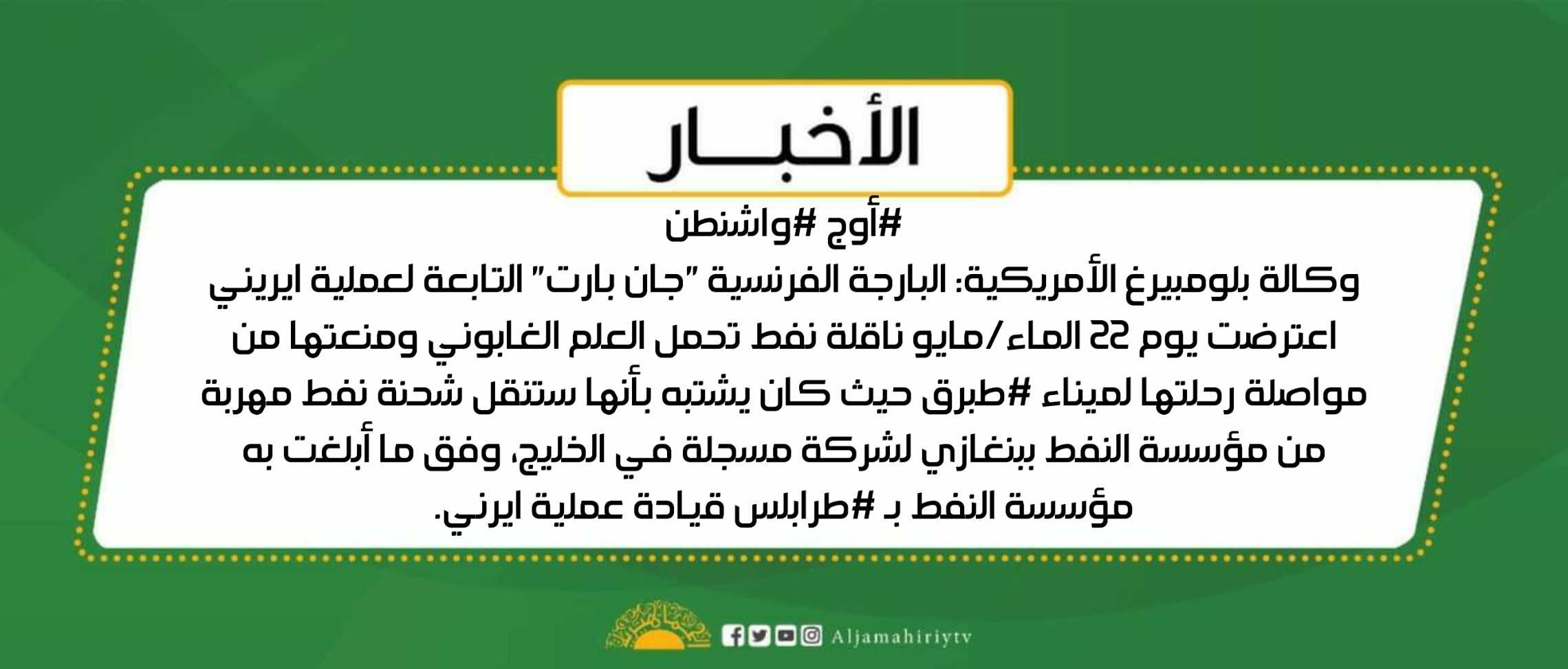 #أوج #واشنطن وكالة بلومبيرغ الأمريكية: البارجة الفرنسية "جان بارت" التابعة لعملية ايريني اعترضت يوم 22 الماء/مايو ناقلة نفط تحمل العلم الغابوني ومنعتها من مواصلة رحلتها لميناء #طبرق حيث كان يشتبه بأنها ستنقل شحنة نفط مهربة من مؤسسة النفط ببنغازي لشركة مسجلة في الخليج، وفق ما أبلغت به مؤسسة النفط بـ #طرابلس قيادة عملية ايرني.