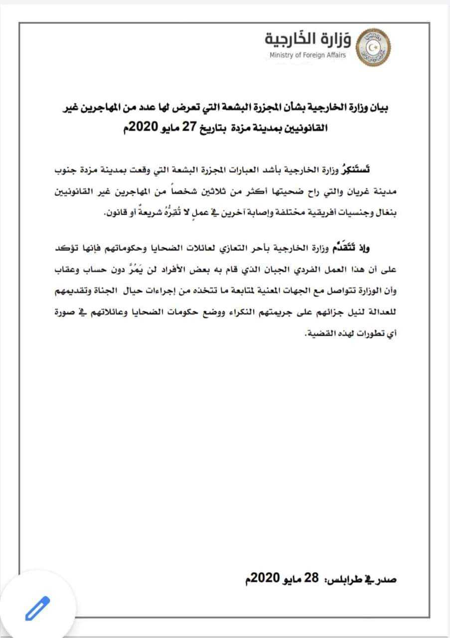 استنكر وزارة الخارجية بحكومة الوفاق غير الشرعية، بأشد العبارات ما وصفتها بـ”المجزرة البشعة” التي وقعت بمدينة مزدة جنوب مدينة غريان والتي راح ضحيتها أكثر من ثلاثين شخصًا من المهاجرين غير القانونيين من بنغال وجنسيات أفريقية مختلفة وإصابة آخرين، مؤكدة أنه عمل لا تُقره شريعة أو قانون، مشيرة إلى أن هذا العمل الفردي الجبان الذي قام به بعض الأفراد لن يمُر دون حساب وعقاب، وأن الوزارة تتواصل مع الجهات المعنية لمتابعة ما تتخذه من إجراءات حيال الجناة وتقديمهم للعدالة لنيل جزائهم على جريمتهم النكراء ووضع حكومات الضحايا وعائلاتهم في صورة أي تطورات لهذه القضية