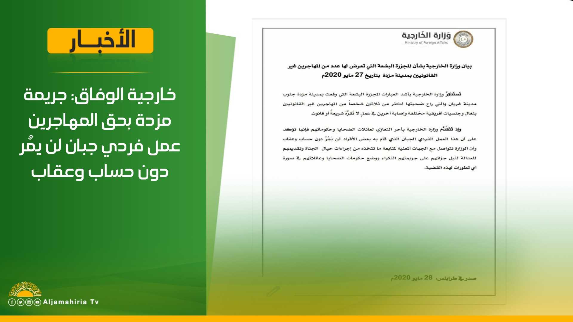خارجية الوفاق: جريمة مزدة بحق المهاجرين عمل فردي جبان لن يمُر دون حساب وعقاب #قناة_الجماهيرية_العظمى_قناة_كل_الجماهير