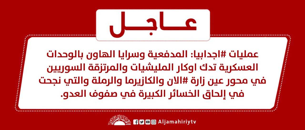 عاجل // عمليات #اجدابيا: المدفعية وسرايا الهاون بالوحدات العسكرية تدك اوكار المليشيات والمرتزقة السوريين في محور عين زارة #الان والكازيرما والرملة والتي نجحت في إلحاق الخسائر الكبيرة في صفوف العدو #قناة_الجماهيرية_العظمى_قناة_كل_الجماهير
