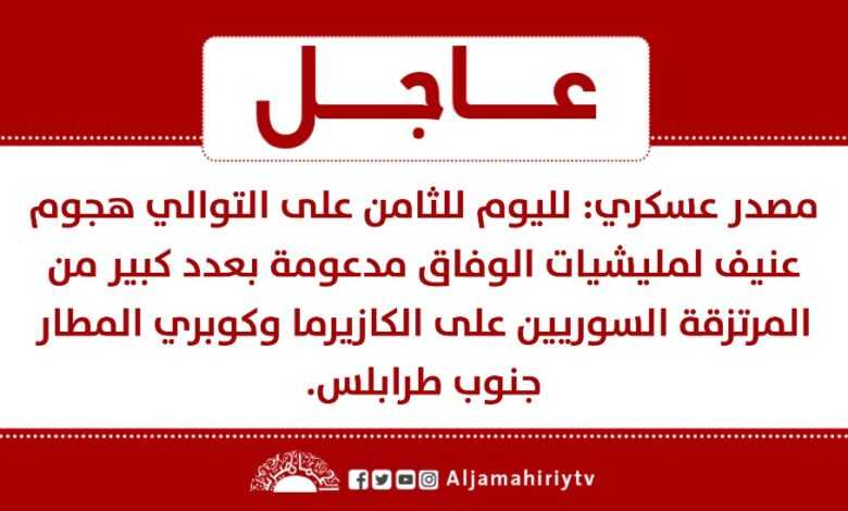 عاجل // مصدر عسكري: لليوم للثامن على التوالي هجوم عنيف لمليشيات الوفاق مدعومة بعدد كبير من المرتزقة السوريين على الكازيرما وكوبري المطار جنوب طرابلس #قناة_الجماهيرية_العظمى_قناة_كل_الجماهير
