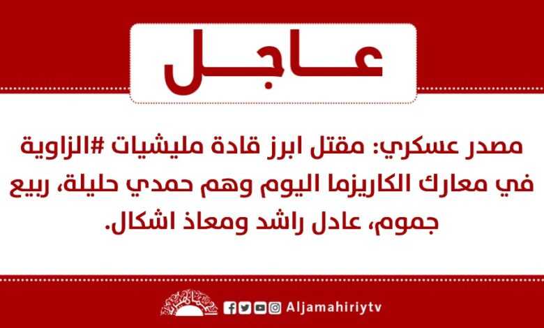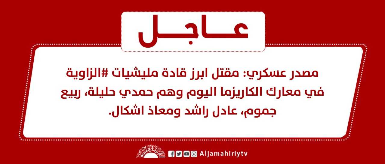 عاجل // مصدر عسكري: مقتل ابرز قادة مليشيات #الزاوية في معارك الكاريزما اليوم وهم حمدي حليلة، ربيع جموم، عادل راشد ومعاذ اشكال #قناة_الجماهيرية_العظمى_قناة_كل_الجماهير