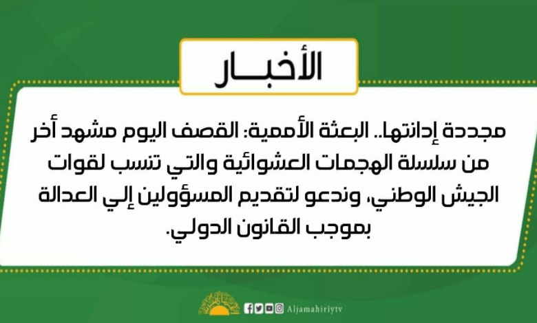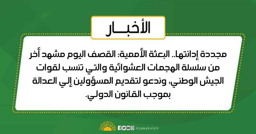 مجددة إدانتها.. البعثة الأممية: القصف اليوم مشهد أخر من سلسلة الهجمات العشوائية والتي تنسب لقوات الجيش الوطني، وندعو لتقديم المسؤولين إلي العدالة بموجب القانون الدولي #قناة_الجماهيرية_العظمى_قناة_كل_الجماهير